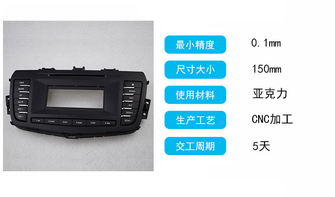 如圖就是拓維模型制作的一款汽車控制面板手板,這個汽車面板是XX汽車公司他們需要研發的新型汽車上的一個零部件,其實我們拓維已經跟這家汽車公司有長期的合作關系,一般他們需要做手板都是發到我們這個來做。下面是有關這個汽車控制面板手板的一些參數: